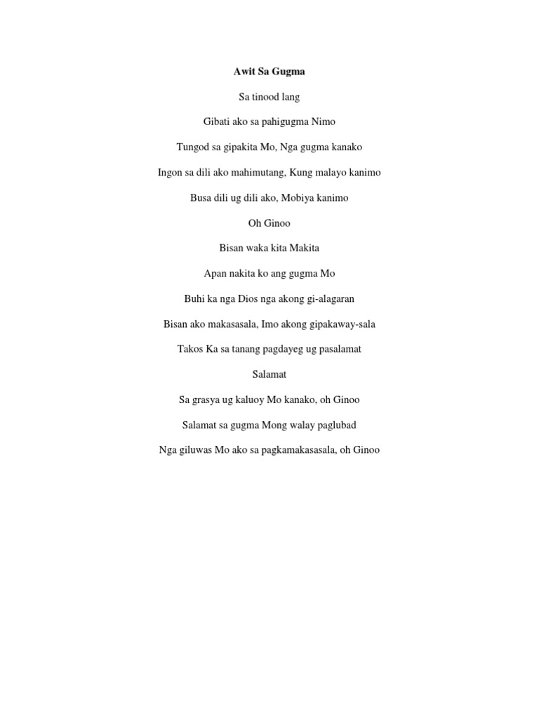 Paminawa ang gugma sa Ginoo para sa atua walay paglubad. Bisan ako makasasala Imo akong gipakaway sala Takus ka sa tanang pagdayeg ug pasalamat. Oh Diyos Ikaw lang ang paglaum ko.